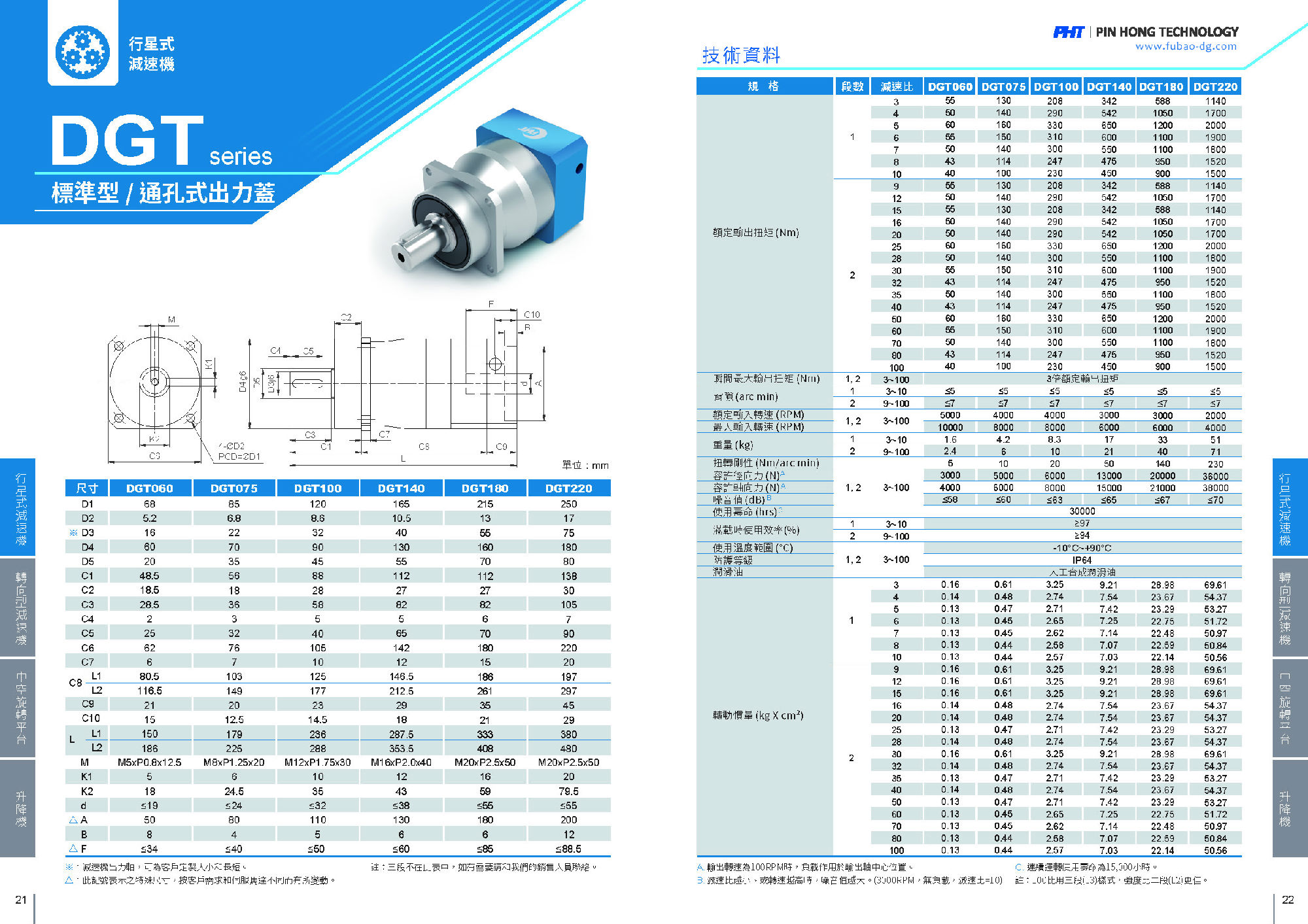 DGT系列是標(biāo)準(zhǔn)型高精度減速機(jī)。 適合精度定位之需求,齒輪采用合金鋼材,內(nèi)部搭配圓錐滾子軸承,使之可承受更佳的負(fù)載,安裝孔位為通孔式。 品宏減速機(jī)的軸承是用NSK品牌的,齒輪經(jīng)過碳化,故精度和剛性都比較優(yōu)越!減速機(jī)出力軸是可根據(jù)客戶的要求去定制大小和長短的。